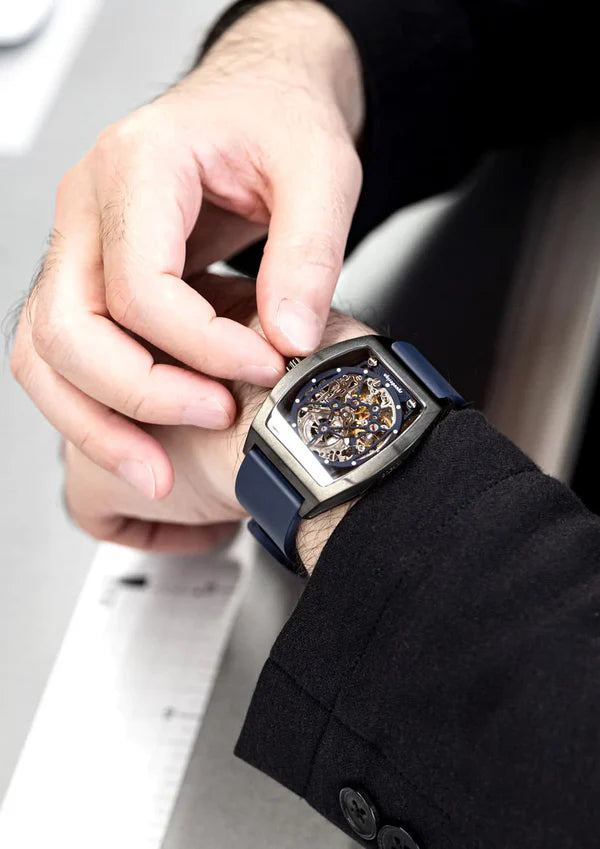 一款外型精美的鏤空機械腕錶,搭載超薄手動上鍊機芯,並採用引人注目的酒桶形錶殼。